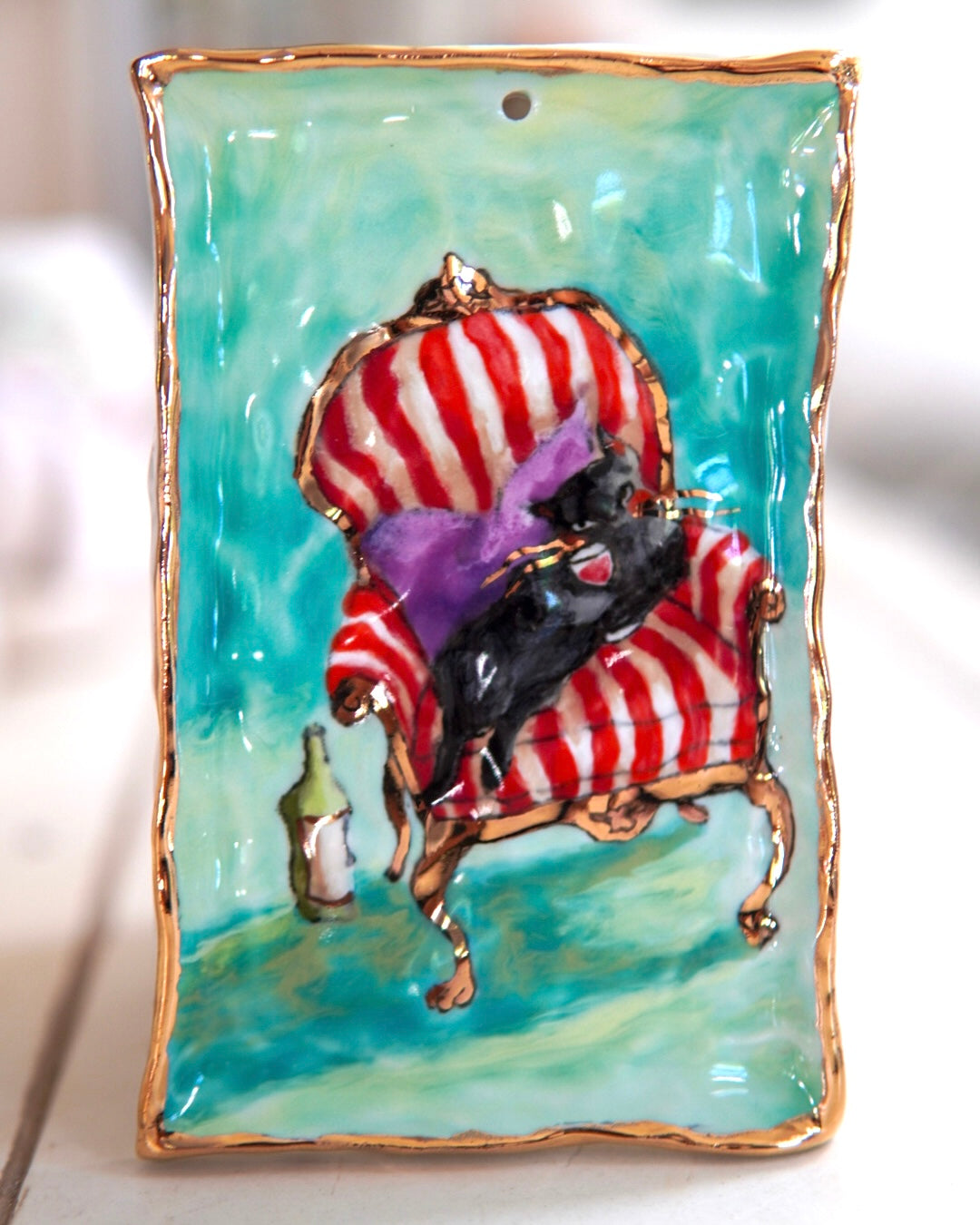 This porcelain has been shaped and painted by hand. A small top hole makes for easy wall mounting on a simple nail or, for a touch of romance, tie with a silk ribbon. This piece is both heirloom and artwork: kiln-fired, gilded, and entirely unique.