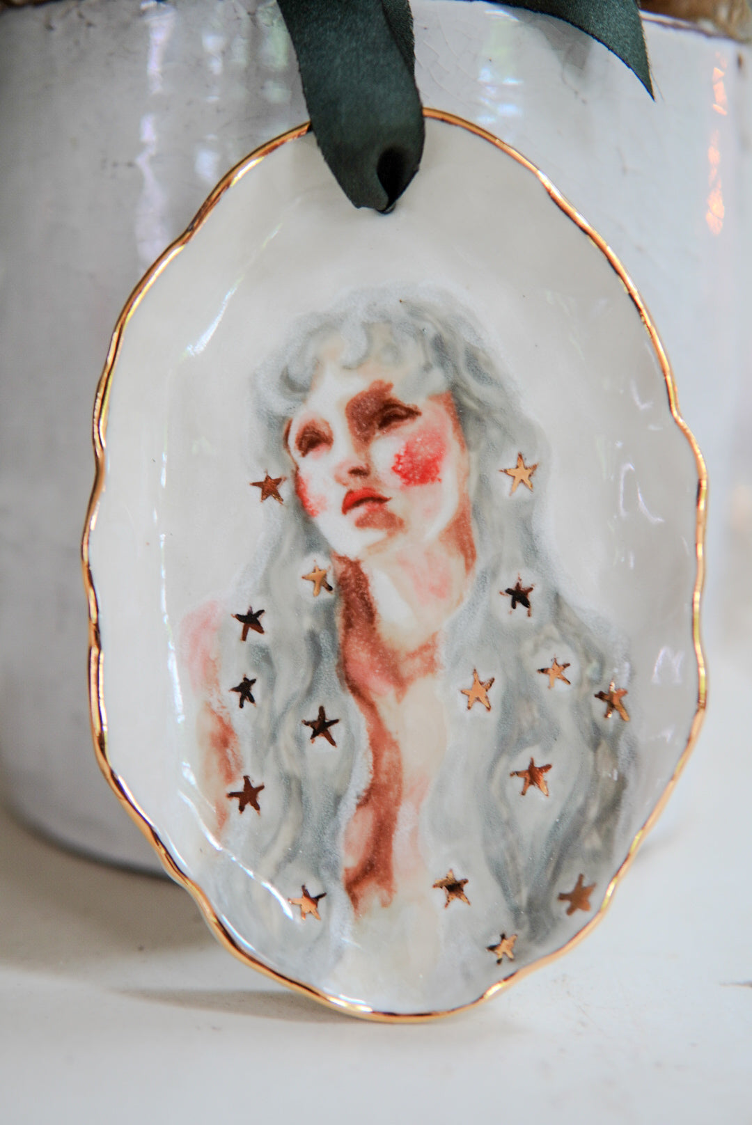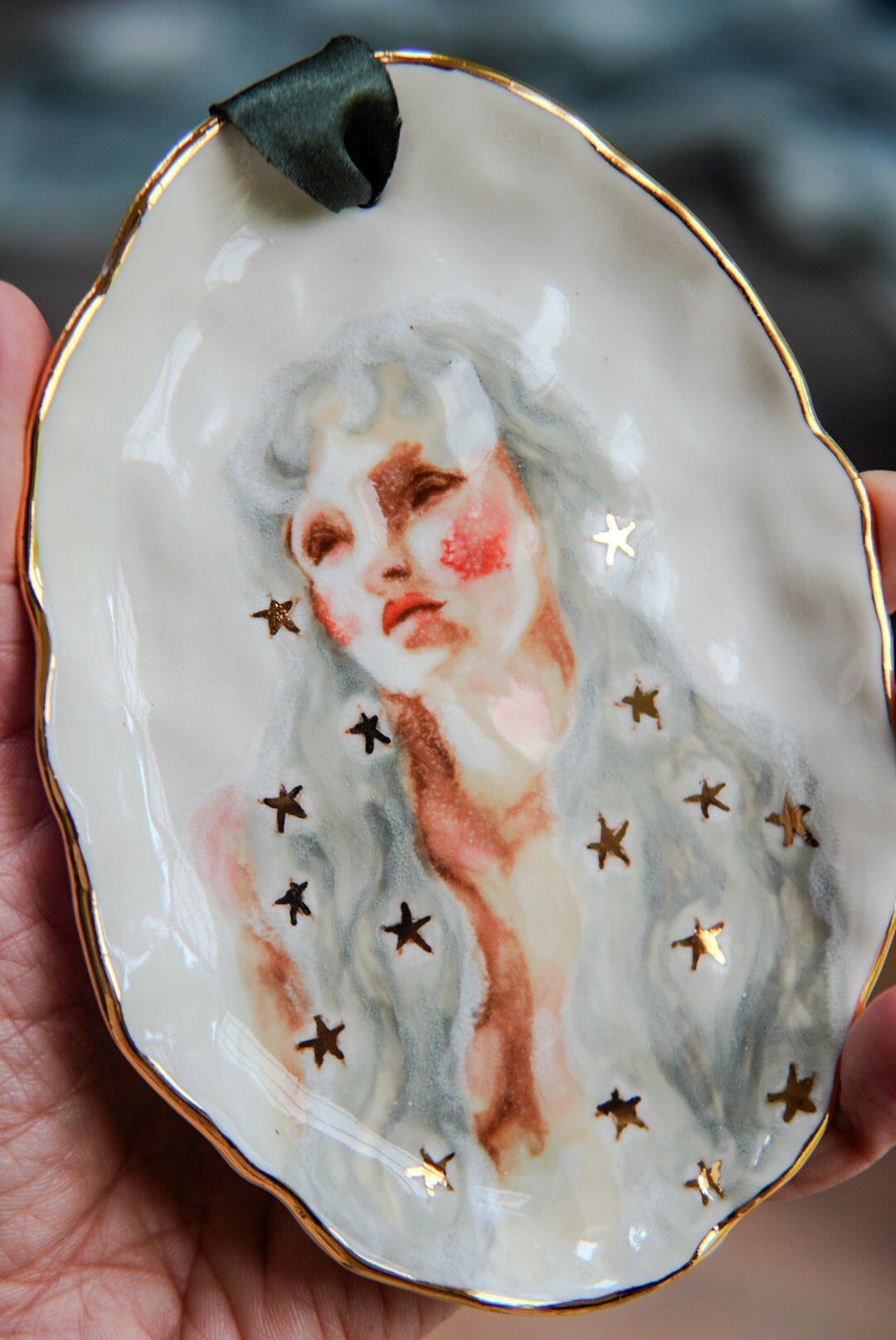 • Porcelain, underglaze, 22k gold luster, silk ribbon