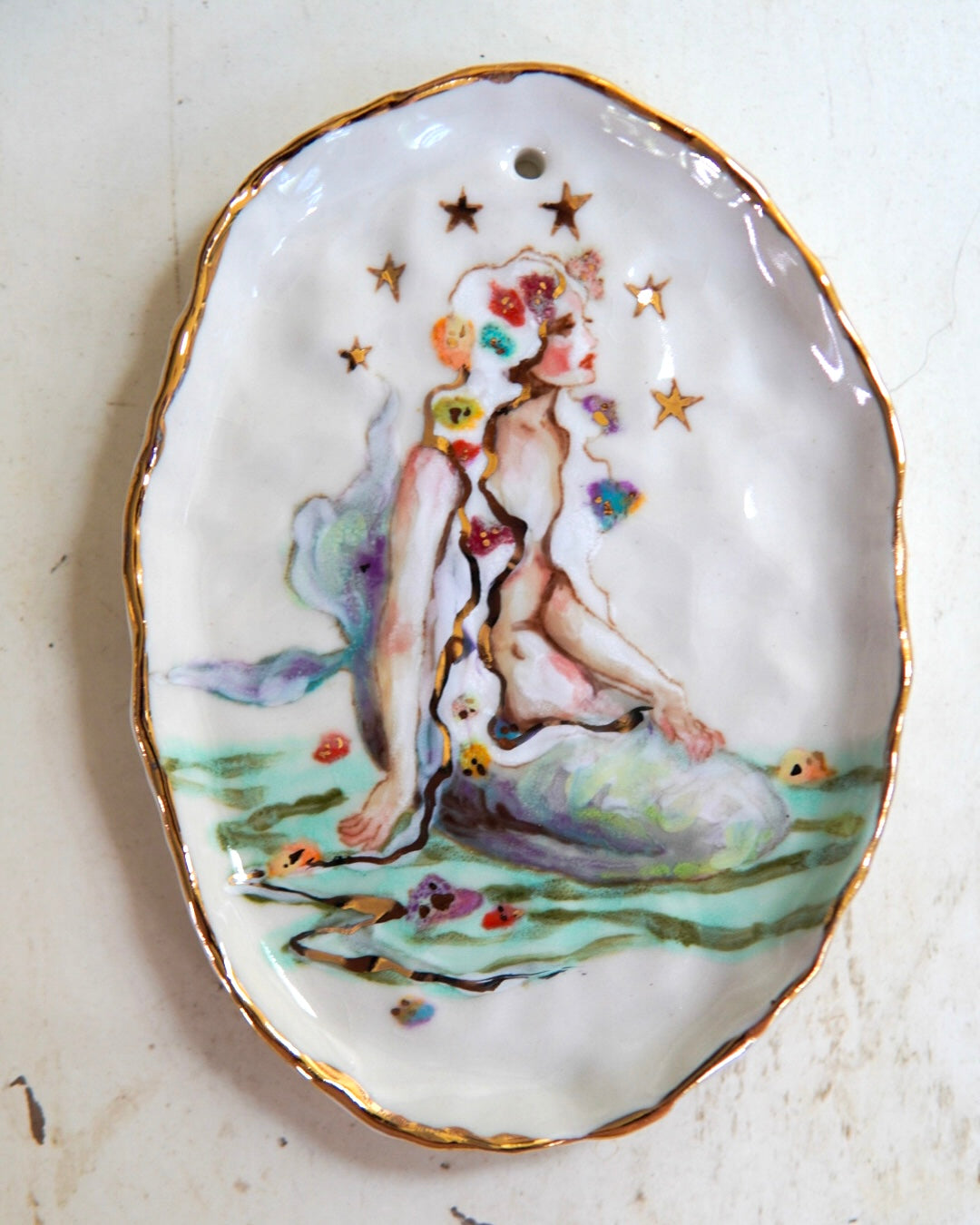 This porcelain has been shaped and painted by hand. A small top hole makes for easy wall mounting on a simple nail or, for a touch of romance, tie with a silk ribbon. This piece is both heirloom and artwork: kiln-fired, gilded, and entirely unique.