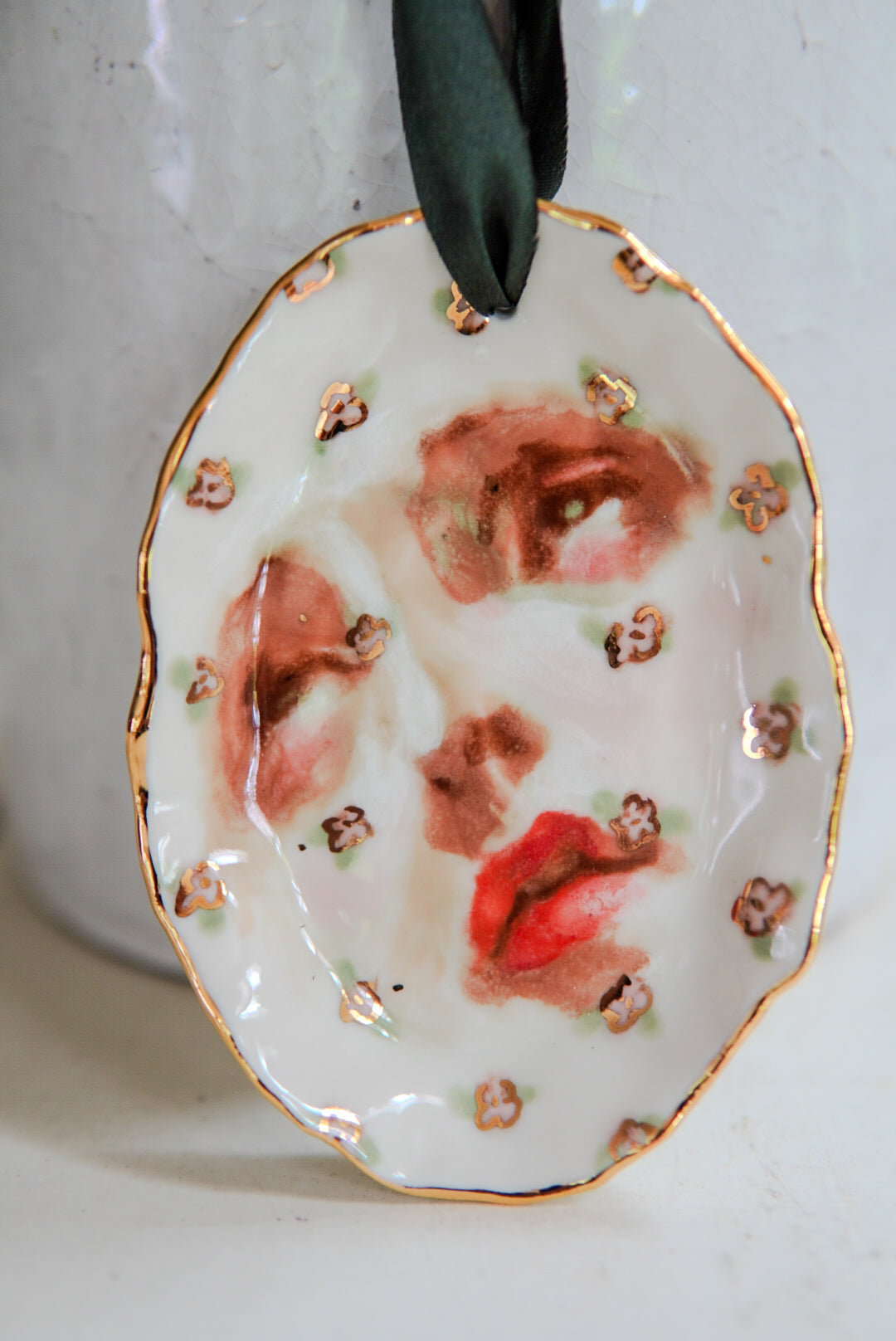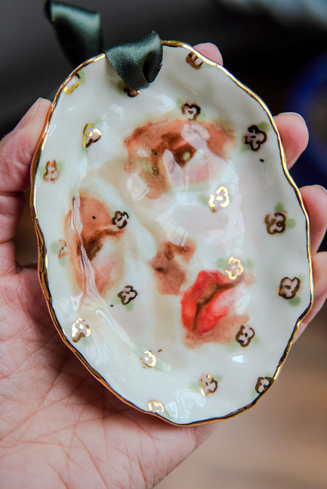 - Porcelain, underglaze, 22k gold luster, silk ribbon